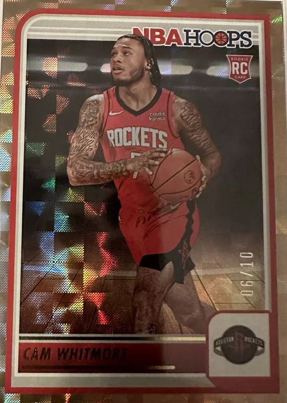 The Cam Whitmore 2023 Hoops #265 Hyper Gold /10 Rookie card in Raw condition has not changed in price in the last 30 days and was last sold for $80.00 .