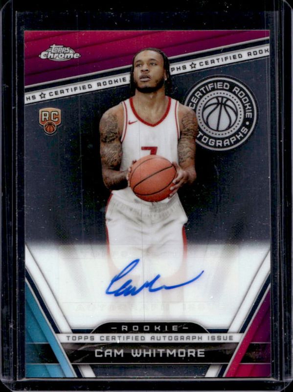 The Cam Whitmore 2023 Topps Chrome Sapphire Edition #CRA-CAW Certified Rookie Autographs card is 1 of 29 Cam Whitmore's card variations in the 2023 Topps Chrome Sapphire Edition set being tracked by Sports Card Investor, including Base, Gold /50, Orange /25, Purple /10, and Red /5.