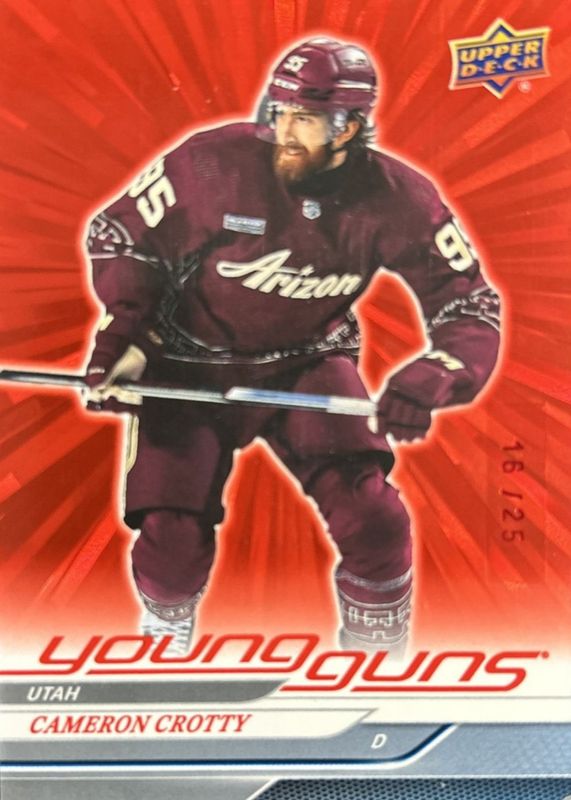 This card is 1 of 8 Cameron Crotty's card variations in the 2024 Upper Deck set being tracked by Sports Card Investor, including Young Guns Base, Young Guns - Clear Cut, Young Guns - Outburst Silver, Young Guns - Deluxe /250, and Young Guns - UD Exclusives /100.