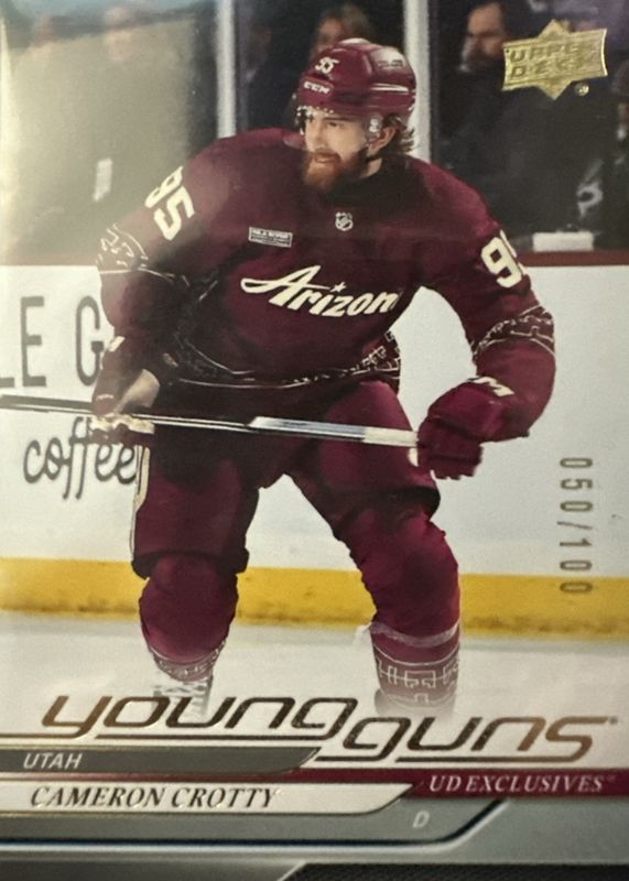 This card is 1 of 8 Cameron Crotty's card variations in the 2024 Upper Deck set being tracked by Sports Card Investor, including Young Guns Base, Young Guns - Clear Cut, Young Guns - Outburst Silver, Young Guns - Deluxe /250, and Young Guns - Outburst Red /25.