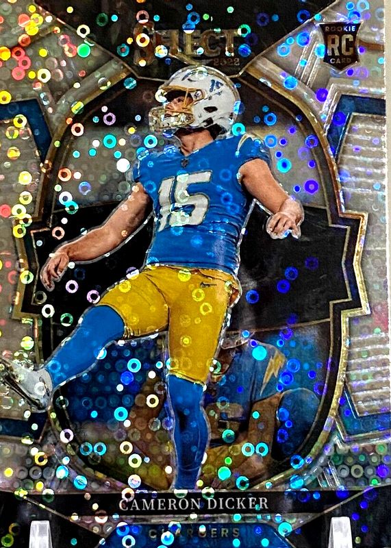 This card is 1 of 41 Cameron Dicker's card variations in the 2022 Select set being tracked by Sports Card Investor, including Concourse, Concourse Black & Green Die-Cut, Concourse Black & Red Die-Cut, Concourse Green & Yellow Die-Cut, and Concourse Red & Blue Die-Cut.