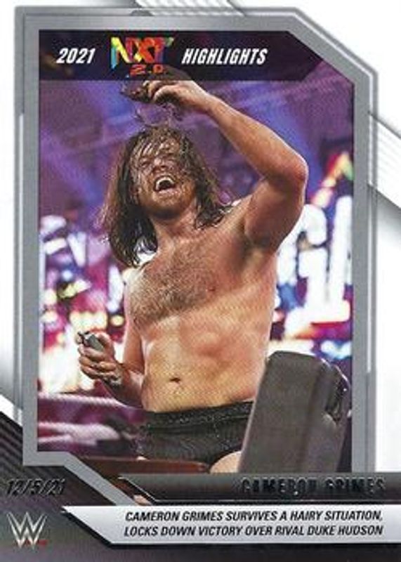 The Cameron Grimes 2022 Panini WWE NXT #39 2021 NXT Highlights card is 1 of 51 Cameron Grimes' card variations in the 2022 Panini WWE NXT set being tracked by Sports Card Investor, including Base, Green, Silver, Red /199, and Blue /149.