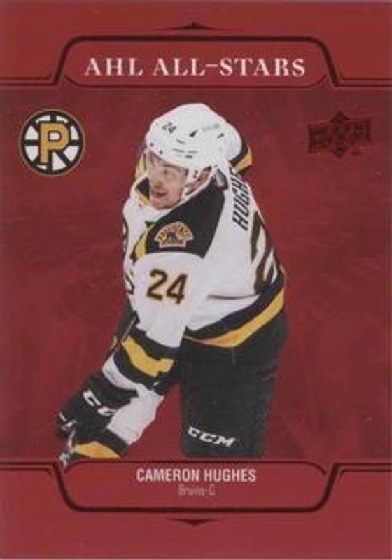 The Cameron Hughes 2021 Upper Deck AHL #AS-5 AHL All Stars - Red card is 1 of 3 Cameron Hughes' card variations in the 2021 Upper Deck AHL set being tracked by Sports Card Investor, including AHL All Stars, and AHL All Stars - Gold /25.