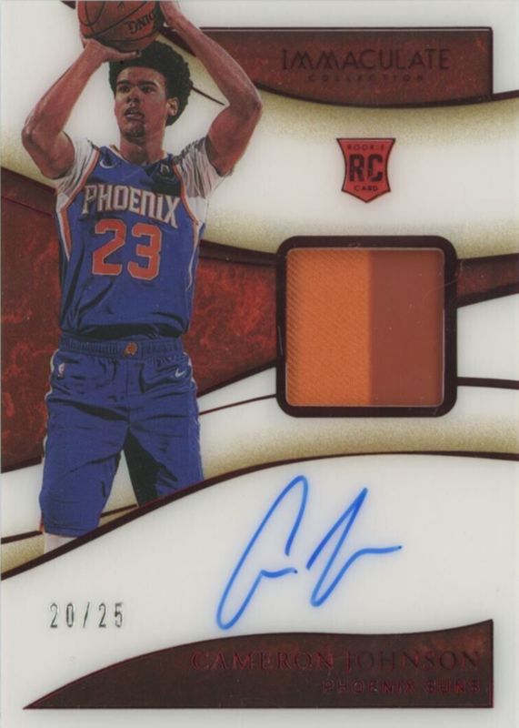 This card is 1 of 6 Cameron Johnson's card variations in the 2019 Immaculate set being tracked by Sports Card Investor, including Rookie Patch Auto - Jersey Number (/23), Rookie Patch Auto /99, Rookie Patch Auto - Gold /10, Rookie Patch Auto - Tag /5, and Rookie Patch Auto - Logoman /1.