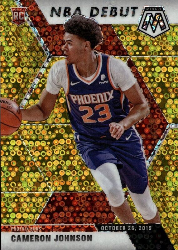 The Cameron Johnson 2019 Mosaic #265 NBA Debut - Fast Break Gold /10 Rookie card in Raw condition has not changed in price in the last 30 days and was last sold for $39.00 .