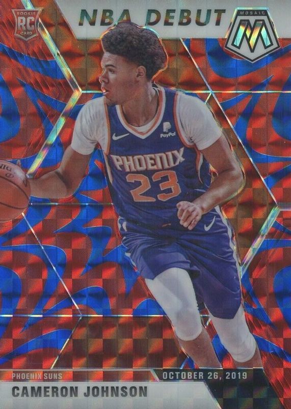 The Cameron Johnson 2019 Mosaic #265 NBA Debut - Reactive Blue Rookie card in Raw condition has not changed in price in the last 30 days and was last sold for $0.68 .