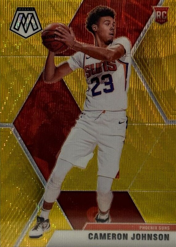 The Cameron Johnson 2019 Mosaic #203 Tmall Gold Wave Rookie card in Raw condition has not changed in price in the last 30 days and was last sold for $0.99 .