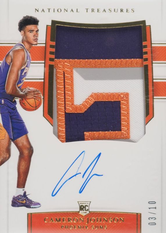 This card is 1 of 8 Cameron Johnson's card variations in the 2019 National Treasures set being tracked by Sports Card Investor, including Rookie Patch Auto /99, Rookie Patch Auto - Stars & Stripes /30, Rookie Patch Auto - Emerald /5, Rookie Patch Auto - Stars & Stripes Blue /3, and Rookie Patch Auto - Logoman /1.