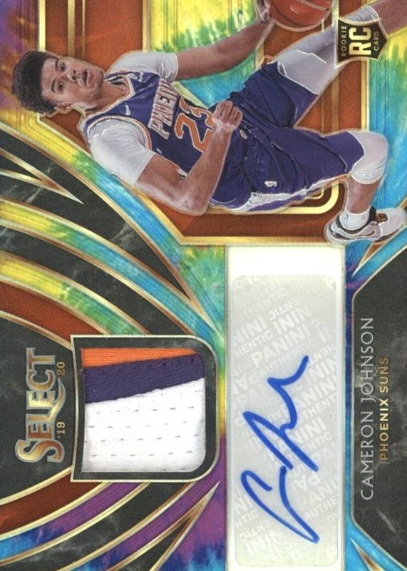 The Cameron Johnson 2019 Select #RJA-CJN Rookie Jersey Autographs - Tie-Dye /25 card in Raw condition has not changed in price in the last 30 days and was last sold for $39.58 .