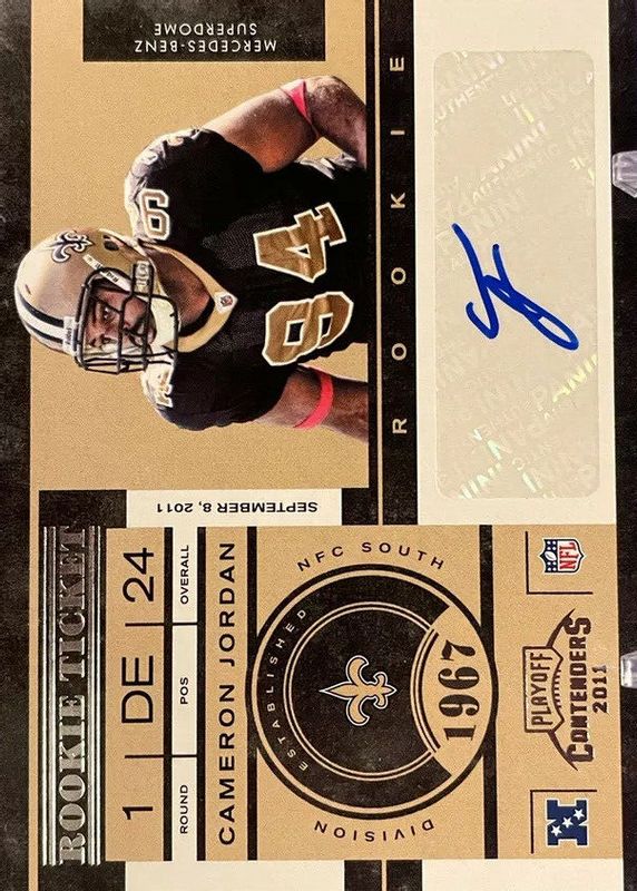 Cameron Jordan's Football cards are available in at least 31 sets. Cameron Jordan's biggest 7-day price movers are 2011 Contenders #116 Rookie Ticket Auto, 2011 Topps Chrome #39 Refractor, and 2011 Topps Chrome #39 Base.