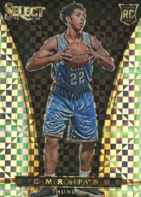 This card is 1 of 16 Cameron Payne's card variations in the 2015 Select set being tracked by Sports Card Investor, including Courtside, Premier Level, Premier Level Silver, Premier Level Tri-Color, and Premier Level Light Blue Die-Cut /199.