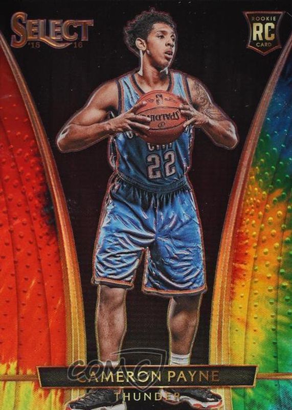 This card is 1 of 16 Cameron Payne's card variations in the 2015 Select set being tracked by Sports Card Investor, including Courtside, Courtside Silver, Premier Level, Premier Level Silver, and Premier Level Tri-Color.