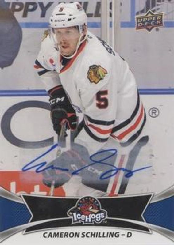 The Cameron Schilling 2016 Upper Deck AHL #45 Autographs card is 1 of 8 Cameron Schilling's card variations in the 2016 Upper Deck AHL set being tracked by Sports Card Investor, including Base, Green, Red, Printing Plates Black /1, and Printing Plates Cyan /1.