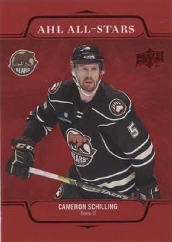 The Cameron Schilling 2021 Upper Deck AHL #AS-9 AHL All Stars - Red card is 1 of 13 Cameron Schilling's card variations in the 2021 Upper Deck AHL set being tracked by Sports Card Investor, including Base, Exclusives /100, High Gloss /10, AHL All Stars, and AHL All Stars Autographs.