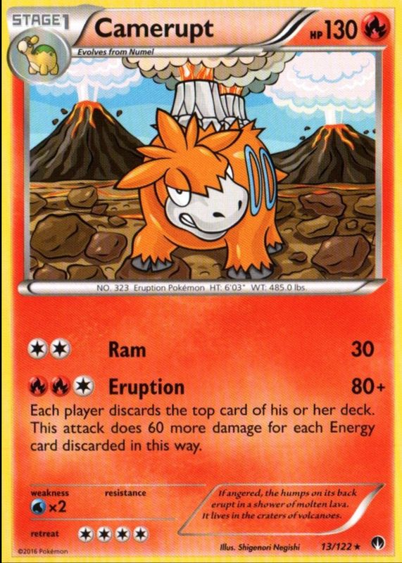 The Camerupt 2016 XY: BREAKpoint #013/122 Base card in Raw TCG (Lightly Played) condition has not changed in price in the last 30 days and was last sold for $0.99 .