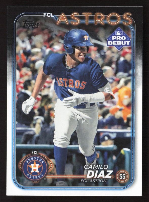 The Camilo Diaz 2024 Topps Pro Debut #PD-182 Base card is 1 of 37 Camilo Diaz's card variations in the 2024 Topps Pro Debut set being tracked by Sports Card Investor, including Fuchsia Foil /199, Sparkle Foil /175, Blue Foil /150, Green Foil /99, and Aqua Foil /75.