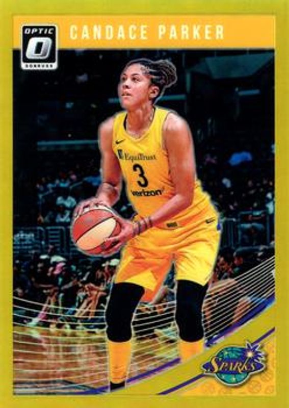 The Candace Parker 2019 Donruss WNBA #80 Optic Gold /10 card is 1 of 24 Candace Parker's card variations in the 2019 Donruss WNBA set being tracked by Sports Card Investor, including Base, Optic, Optic Holo, Silver Press Proof /199, and Purple Press Proof /99.