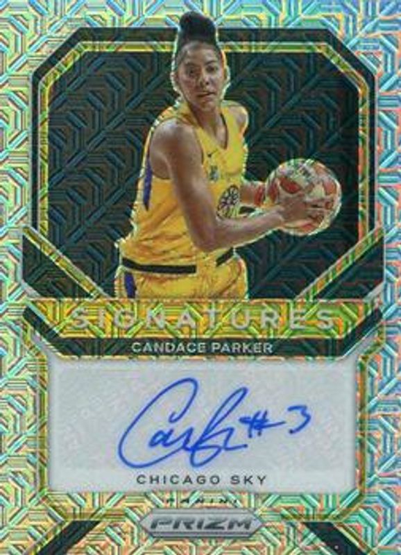 The Candace Parker 2021 Prizm WNBA #SG-CPK Signatures - Mojo /25 card is 1 of 57 Candace Parker's card variations in the 2021 Prizm WNBA set being tracked by Sports Card Investor, including Base, Green, Green Ice, Hyper, and Ice.