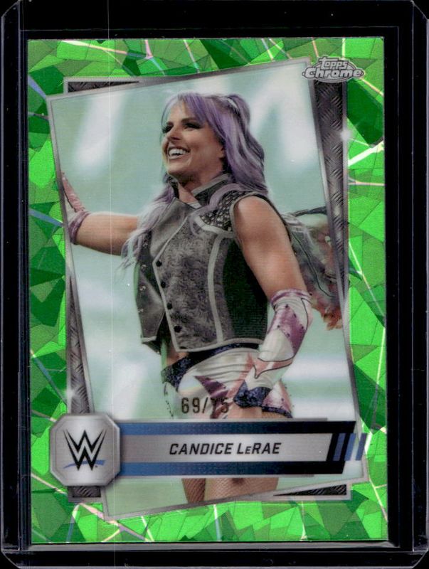 The Candice LeRae 2025 Topps Chrome WWE Sapphire Edition #180 Base Chrome - Green Refractor /75 card is 1 of 11 Candice LeRae's card variations in the 2025 Topps Chrome WWE Sapphire Edition set being tracked by Sports Card Investor, including Base Chrome, Blue Brand Autographs, Base Chrome - Gold Refractor /50, Base Chrome - Orange Refractor /25, and Blue Brand Autographs - Orange Refractor /25.