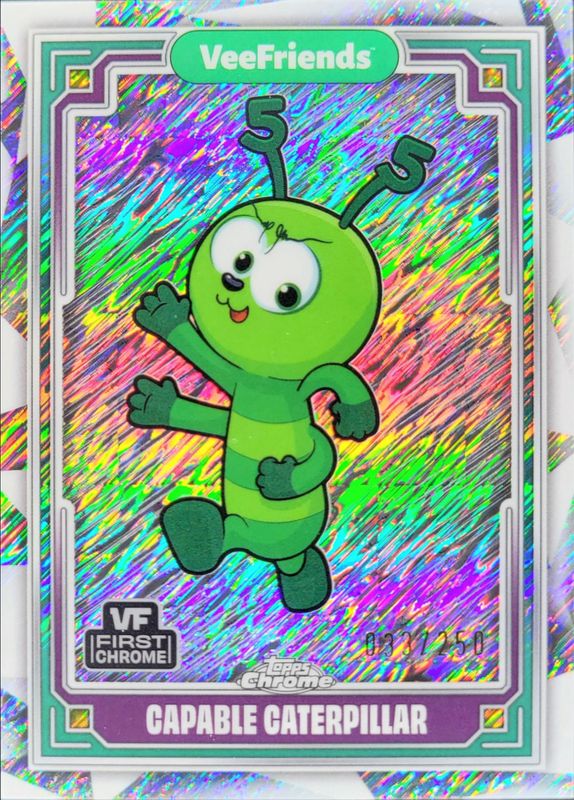 The Capable Caterpillar 2025 Topps Chrome VeeFriends #40 Shimmer Refractor /250 card is 1 of 21 Capable Caterpillar's card variations in the 2025 Topps Chrome VeeFriends set being tracked by Sports Card Investor, including Base, Refractor, Yellow Refractor, RayWave Refractor /199, and Wave Refractor /150.