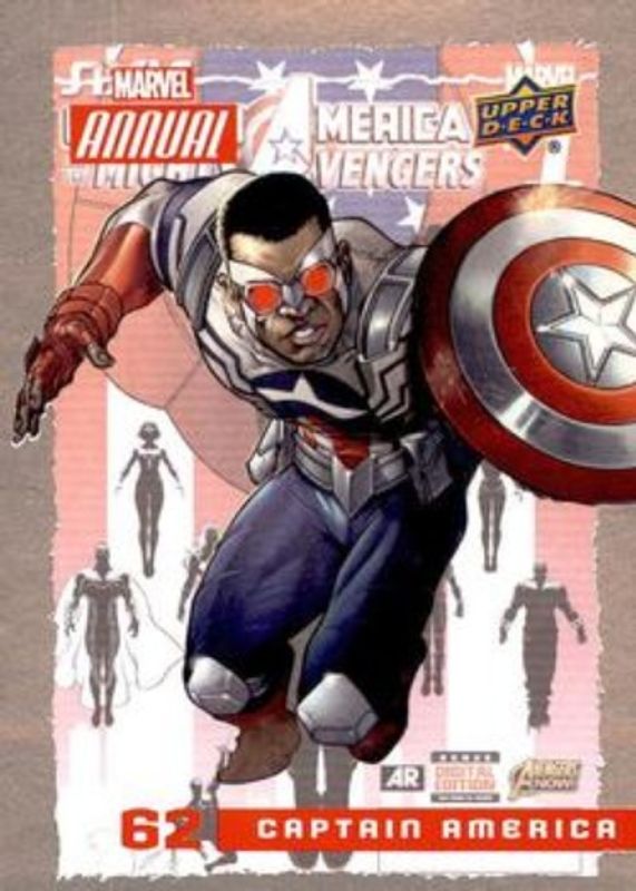 The Captain America 2020 Upper Deck Marvel Annual #62 Base card is 1 of 20 Captain America's card variations in the 2020 Upper Deck Marvel Annual set being tracked by Sports Card Investor, including #58 Base, #62 Gold, #58 Gold, #58 Red, and #62 Red.