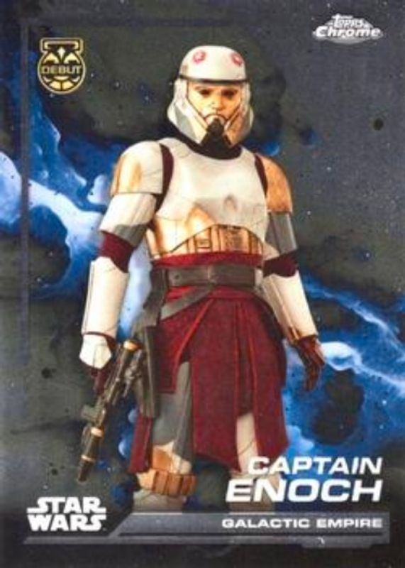 The Captain Enoch 2024 Topps Chrome Star Wars #99 Base Rookie card is 1 of 24 Captain Enoch's card variations in the 2024 Topps Chrome Star Wars set being tracked by Sports Card Investor, including Blue Blaster Pulsar Refractor, Costco Super Box, Costco Super Box Refractor, Rainbow Refractor, and Red Blaster RayWave Refractor.