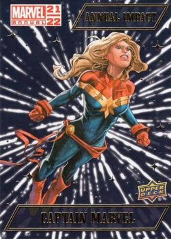 The Captain Marvel 2021 Upper Deck Marvel Annual #AI-1 Annual Impact card is 1 of 17 Captain Marvel's card variations in the 2021 Upper Deck Marvel Annual set being tracked by Sports Card Investor, including Base, Blue, Canvas Variant, Green, and Magenta.