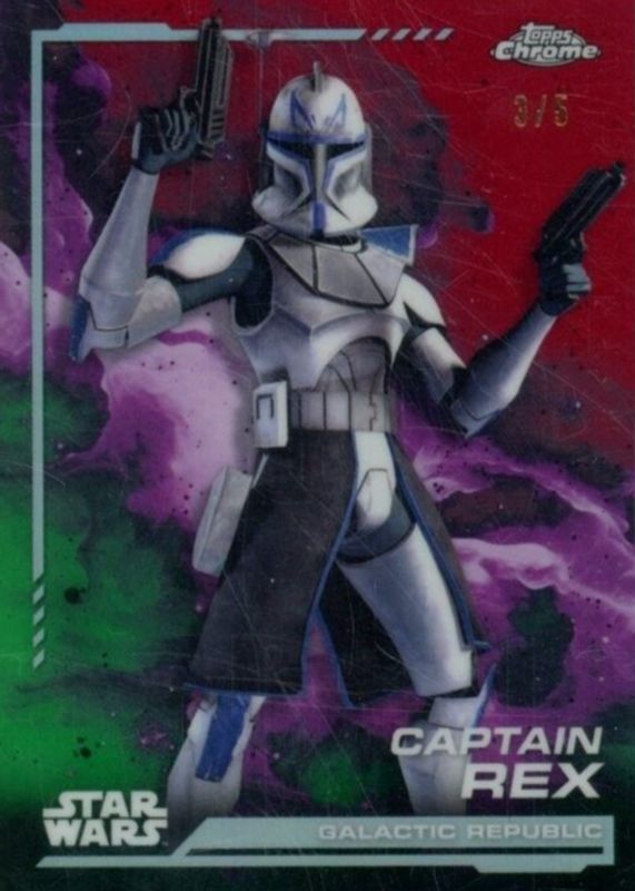 This card is 1 of 26 Captain Rex's card variations in the 2024 Topps Chrome Star Wars set being tracked by Sports Card Investor, including Base, Blue Blaster Pulsar Refractor, Costco Super Box, Costco Super Box Refractor, and Rainbow Refractor.