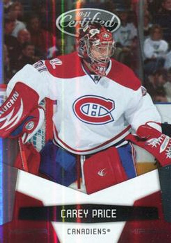 The Carey Price 2010 Certified #75 Mirror Red /100 card is 1 of 44 Carey Price's card variations in the 2010 Certified set being tracked by Sports Card Investor, including Base /799, Platinum Red /999, Platinum Blue /250, Mirror Red Materials Dual /150, and Mirror Blue Materials /100.