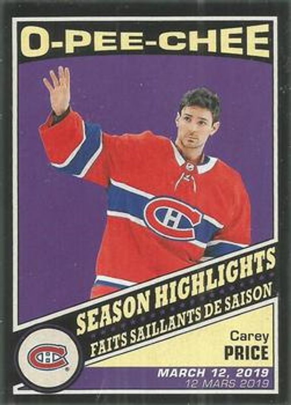 Carey Price 2019 O-Pee-Chee #600 Retro Black Border /100 RAW Price Guide