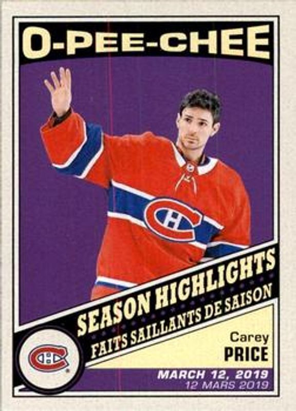 Carey Price 2019 O-Pee-Chee #600 Retro Blank Back RAW Price Guide