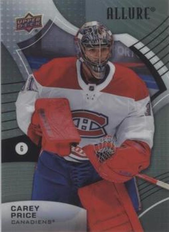 The Carey Price 2021 Upper Deck Allure #71 Steel card is 1 of 31 Carey Price's card variations in the 2021 Upper Deck Allure set being tracked by Sports Card Investor, including Base, Black Rainbow, Blue China, Orange Slice die-cut, and Pink Blue Leopard.