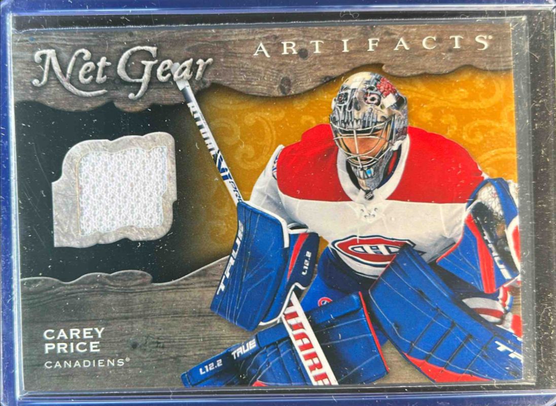 The Carey Price 2021 Upper Deck Artifacts #NG-CP Net Gear card is 1 of 33 Carey Price's card variations in the 2021 Upper Deck Artifacts set being tracked by Sports Card Investor, including Base /999, Neon Green, Rose Gold, Turquoise, and Ruby /499.