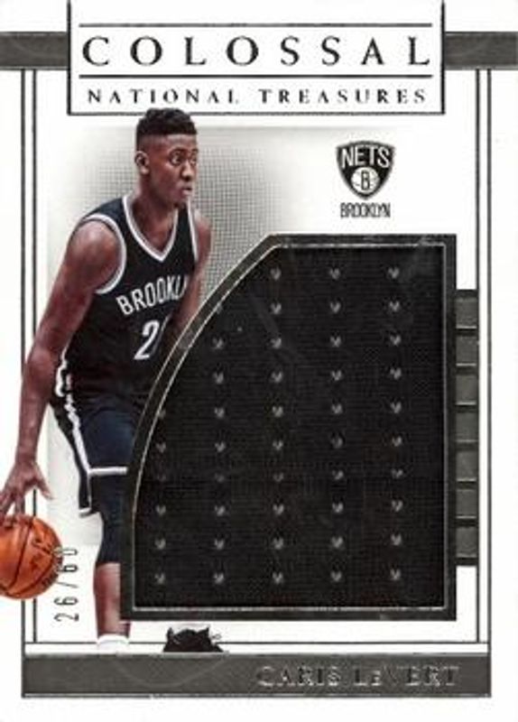 The Caris LeVert 2016 National Treasures #5 Colossal Rookie - Materials /60 card is 1 of 20 Caris LeVert's card variations in the 2016 National Treasures set being tracked by Sports Card Investor, including #155 Base /99, #105 Base /99, #105 Rookie Patch Auto /99, #105 Rookie Patch Auto - Gold /10, and #105 Rookie Patch Auto - Emerald /5.