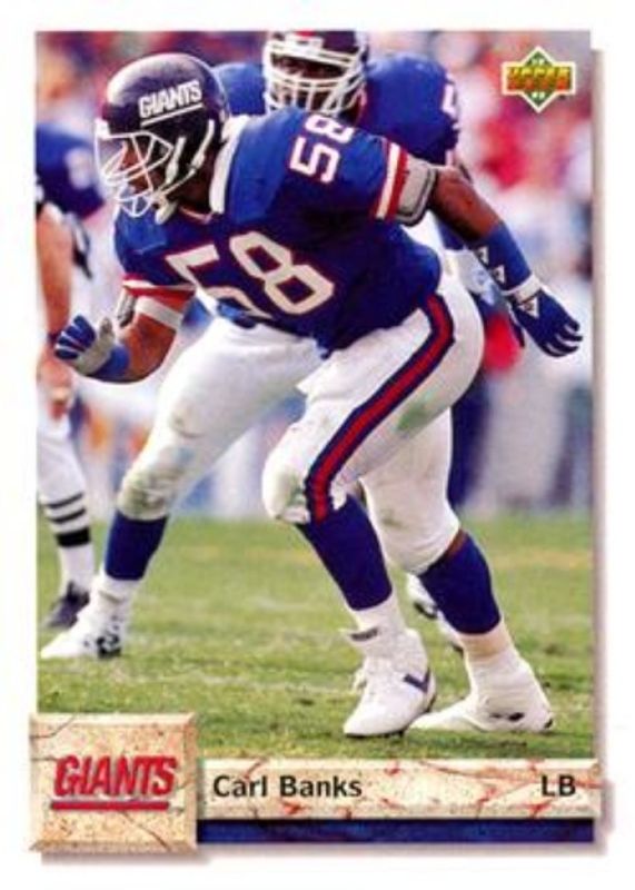 The Carl Banks 1992 Upper Deck #589 Base card is 1 of 2 Carl Banks' card variations in the 1992 Upper Deck set being tracked by Sports Card Investor, including Gold.