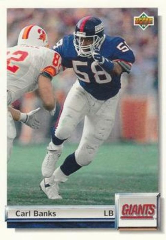 The Carl Banks 1992 Upper Deck #G39 Gold card is 1 of 2 Carl Banks' card variations in the 1992 Upper Deck set being tracked by Sports Card Investor, including Base.