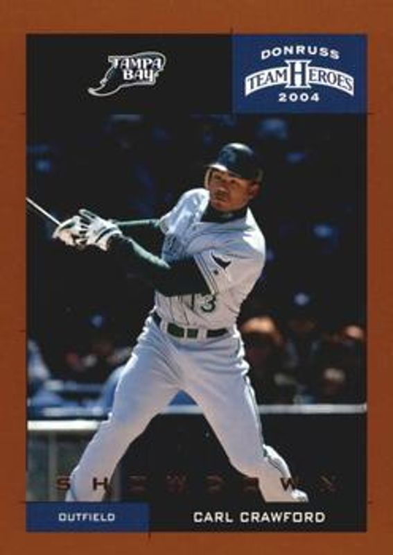 The Carl Crawford 2004 Donruss Team Heroes #404 Showdown - Bronze /150 card is 1 of 4 Carl Crawford's card variations in the 2004 Donruss Team Heroes set being tracked by Sports Card Investor, including Base, Showdown - Silver /50, and Showdown - Gold /10.