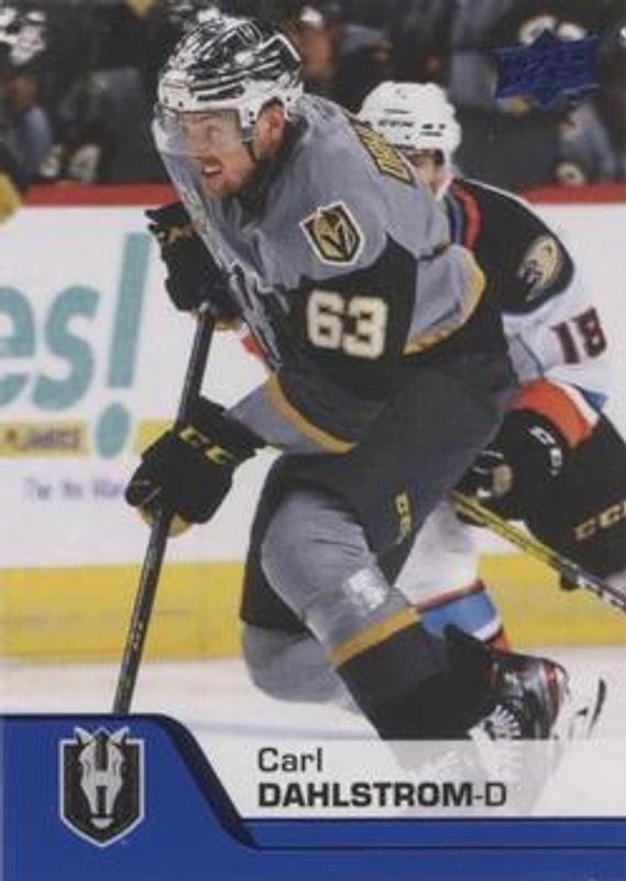 The Carl Dahlstrom 2020 Upper Deck AHL #106 Blue card is 1 of 8 Carl Dahlstrom's card variations in the 2020 Upper Deck AHL set being tracked by Sports Card Investor, including Base, UD Exclusives /100, UD High Gloss /10, Printing Plates Black /1, and Printing Plates Cyan /1.