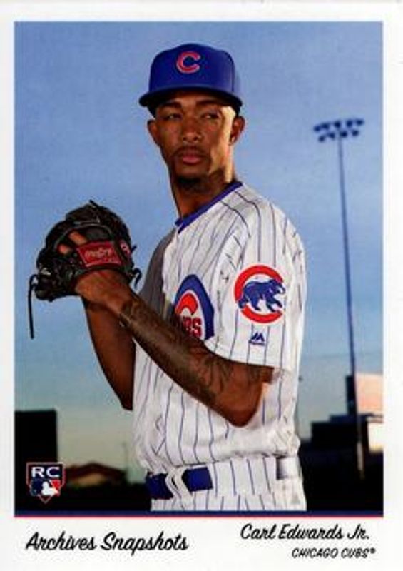 The Carl Edwards Jr. 2016 Topps Archives Snapshots #AS-CEJ Base Rookie card is 1 of 5 Carl Edwards Jr.'s card variations in the 2016 Topps Archives Snapshots set being tracked by Sports Card Investor, including Black & White, Autographs /350, Autographs - Black & White /10, and Autographs - Negative /5.