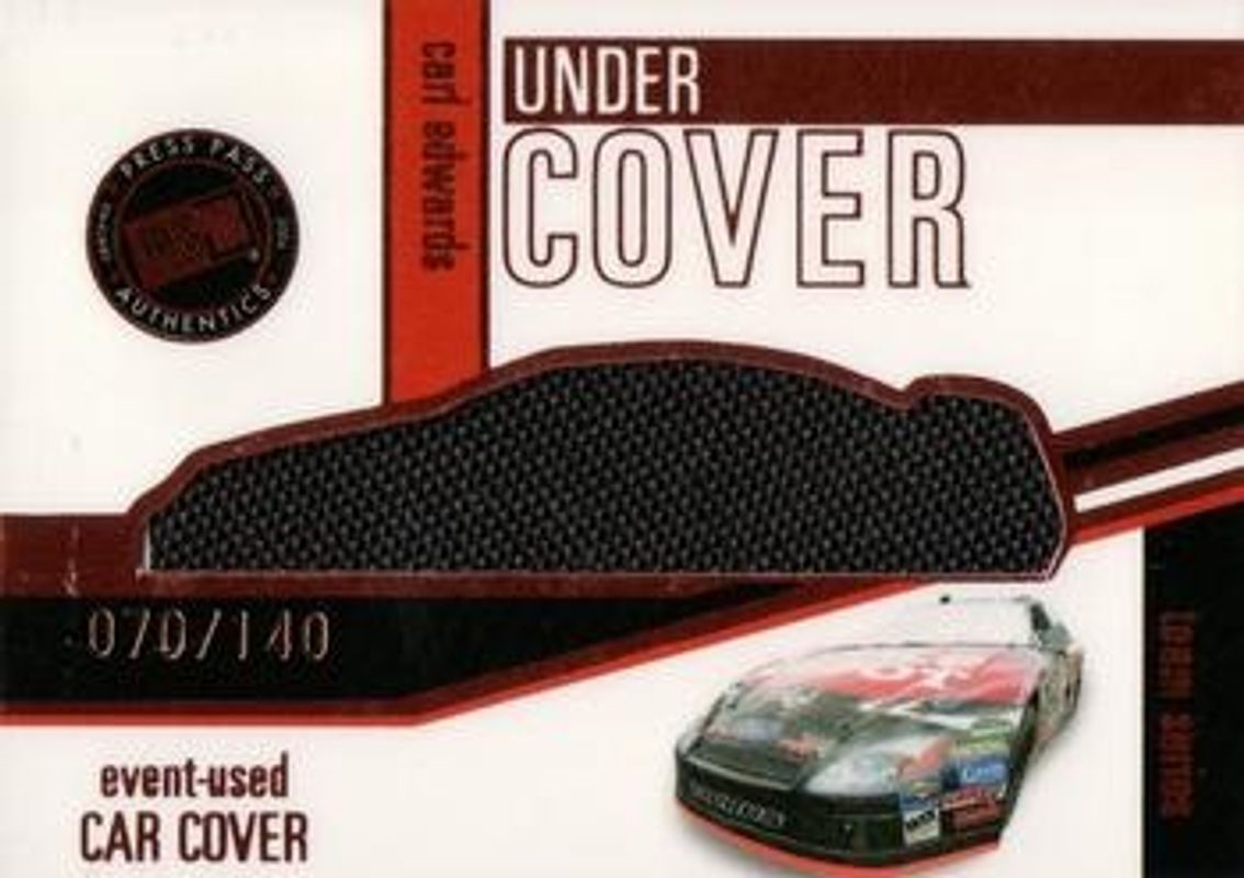 The Carl Edwards 2006 Press Pass Eclipse #UCT-10 Under Cover Cars /140 card is 1 of 22 Carl Edwards' card variations in the 2006 Press Pass Eclipse set being tracked by Sports Card Investor, including #64 Base, #88 Base, #3 Base, #30 Base, and #57 Base.