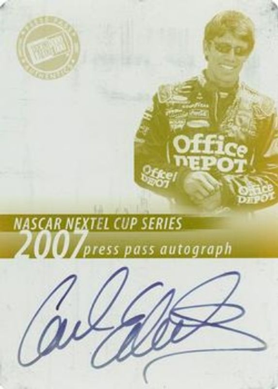 The Carl Edwards 2007 Press Pass Autographs Press Plates Yellow /1 card is 1 of 32 Carl Edwards' card variations in the 2007 Press Pass set being tracked by Sports Card Investor, including #13 Base, #88 Base, #82 Base, #35 Base, and #B35 Blue.