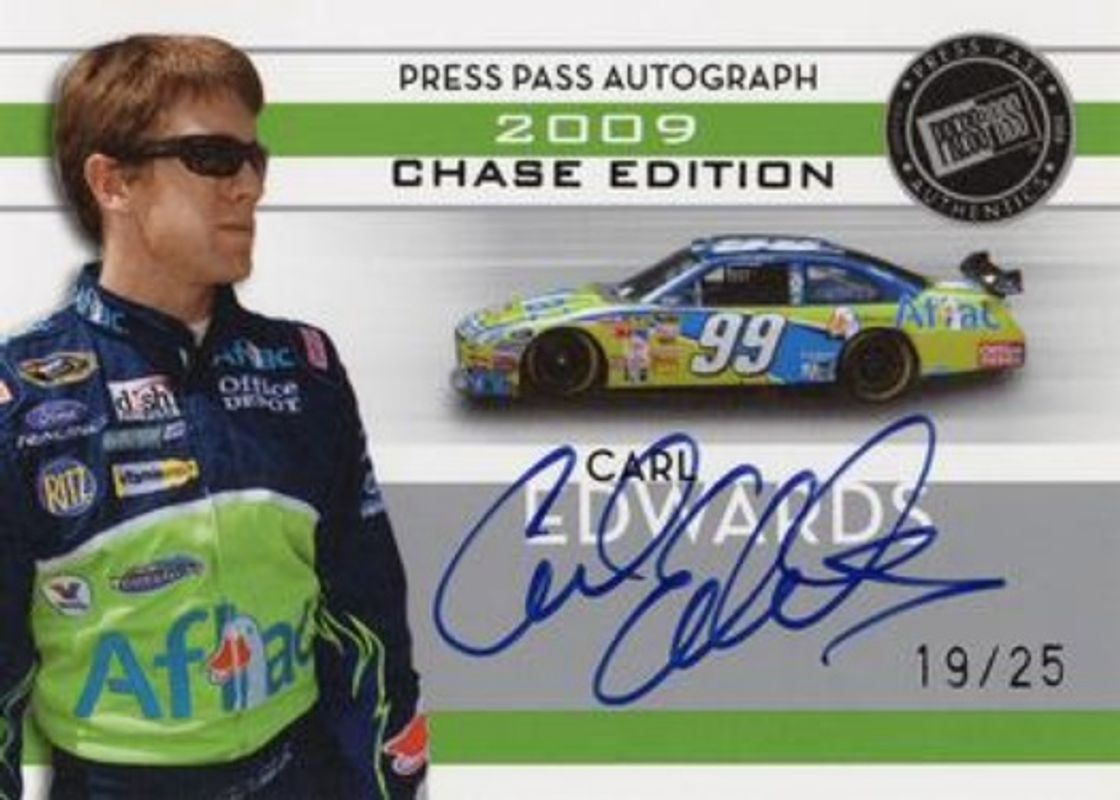 The Carl Edwards 2009 Press Pass Autographs Chase Edition /25 card is 1 of 100 Carl Edwards' card variations in the 2009 Press Pass set being tracked by Sports Card Investor, including #2 Base, #183 Base, #160 Base, #128 Base, and #108 Base.