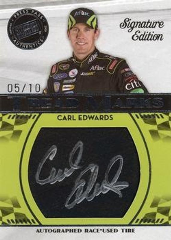 The Carl Edwards 2009 Press Pass #TM-CE Tread Marks Autographs /10 card is 1 of 100 Carl Edwards' card variations in the 2009 Press Pass set being tracked by Sports Card Investor, including #2 Base, #183 Base, #160 Base, #128 Base, and #108 Base.