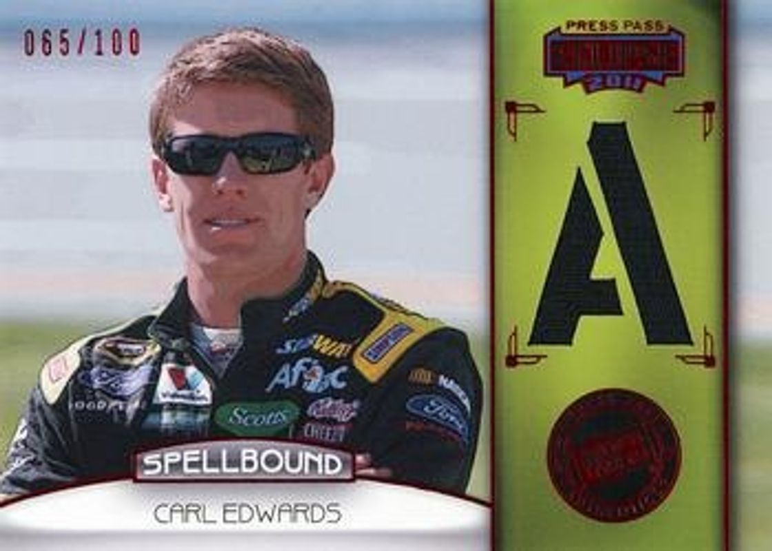 The Carl Edwards 2011 Press Pass Eclipse #SB-CE-4 Spellbound Swatches /250 card is 1 of 22 Carl Edwards' card variations in the 2011 Press Pass Eclipse set being tracked by Sports Card Investor, including #69 Base, #78 Base, #9 Base, #69 Blue, and #78 Blue.