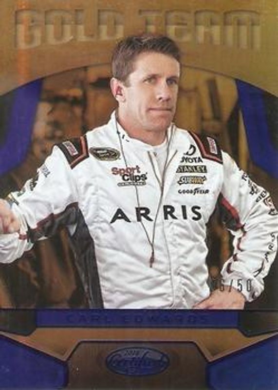 The Carl Edwards 2016 Certified NASCAR #GT11 Gold Team - Mirror Blue /50 card is 1 of 88 Carl Edwards' card variations in the 2016 Certified NASCAR set being tracked by Sports Card Investor, including #4 Base /99, #56 Base /99, #4 Mirror Red /25, #56 Mirror Red /25, and #56 Mirror Blue /20.