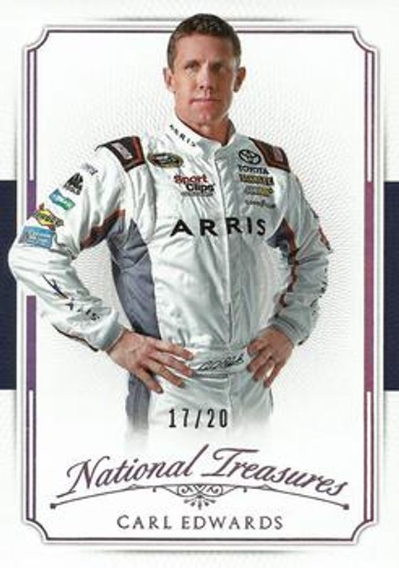 The Carl Edwards 2016 National Treasures NASCAR #23 Century Silver /20 card is 1 of 105 Carl Edwards' card variations in the 2016 National Treasures NASCAR set being tracked by Sports Card Investor, including Base /25, Century Gold /15, Century Black /5, Century Blue /1, and Printing Plates Black /1.