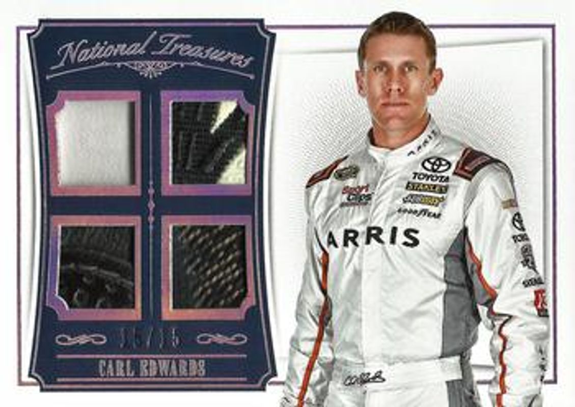 The Carl Edwards 2016 National Treasures NASCAR #QM-ED Quad Materials Silver /15 card is 1 of 105 Carl Edwards' card variations in the 2016 National Treasures NASCAR set being tracked by Sports Card Investor, including Base /25, Century Silver /20, Century Gold /15, Century Black /5, and Century Blue /1.