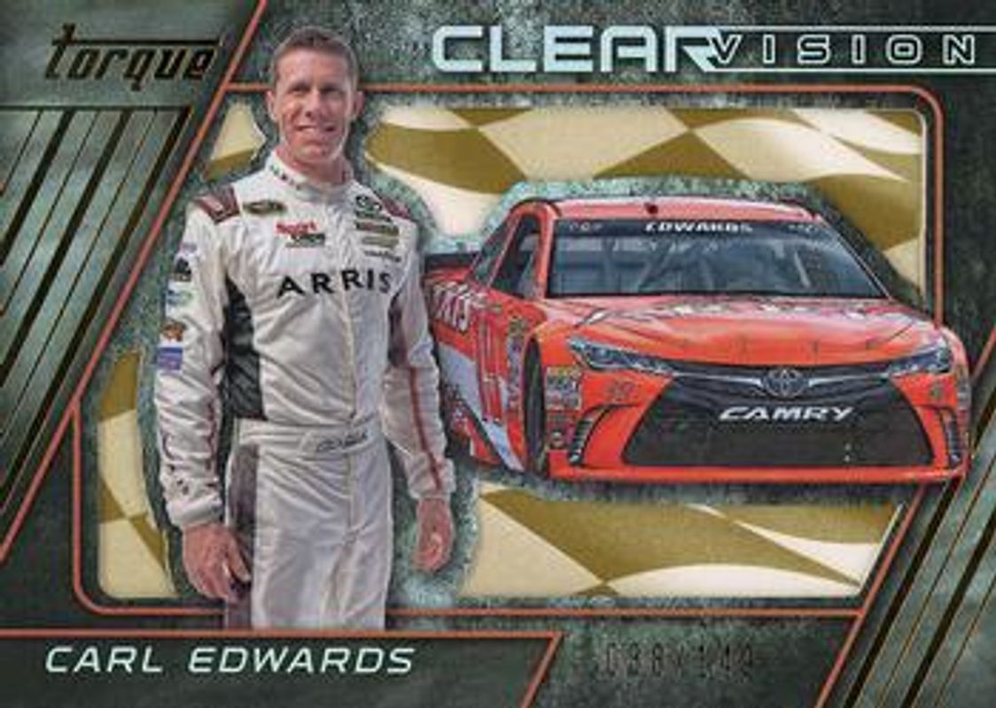 The Carl Edwards 2016 Torque NASCAR #5 Clear Vision Gold /149 card is 1 of 104 Carl Edwards' card variations in the 2016 Torque NASCAR set being tracked by Sports Card Investor, including #82 Base, #5 Base, #82 Gold, #5 Gold, and #82 Blue /125.