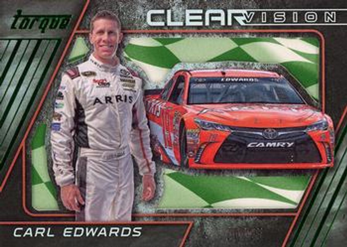The Carl Edwards 2016 Torque NASCAR #5 Clear Vision Green /25 card is 1 of 104 Carl Edwards' card variations in the 2016 Torque NASCAR set being tracked by Sports Card Investor, including #82 Base, #5 Base, #82 Gold, #5 Gold, and #82 Blue /125.