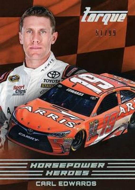 The Carl Edwards 2016 Torque NASCAR #HH5 Horsepower Heroes Holo Silver /99 card is 1 of 104 Carl Edwards' card variations in the 2016 Torque NASCAR set being tracked by Sports Card Investor, including #82 Base, #5 Base, #82 Gold, #5 Gold, and #82 Blue /125.